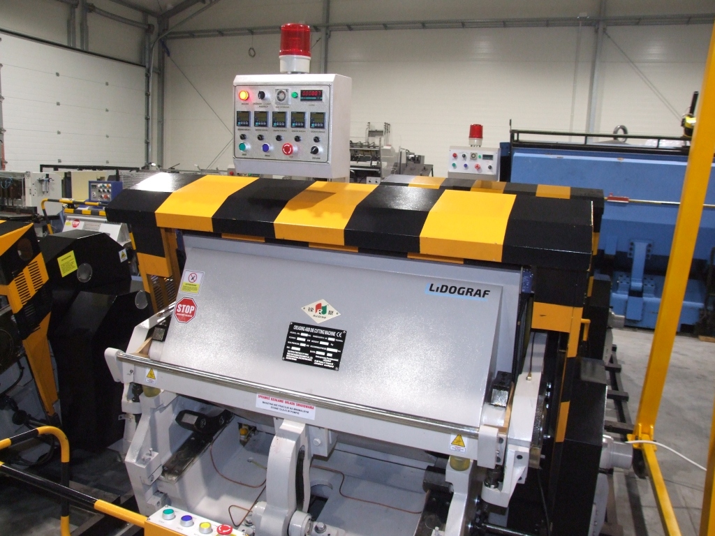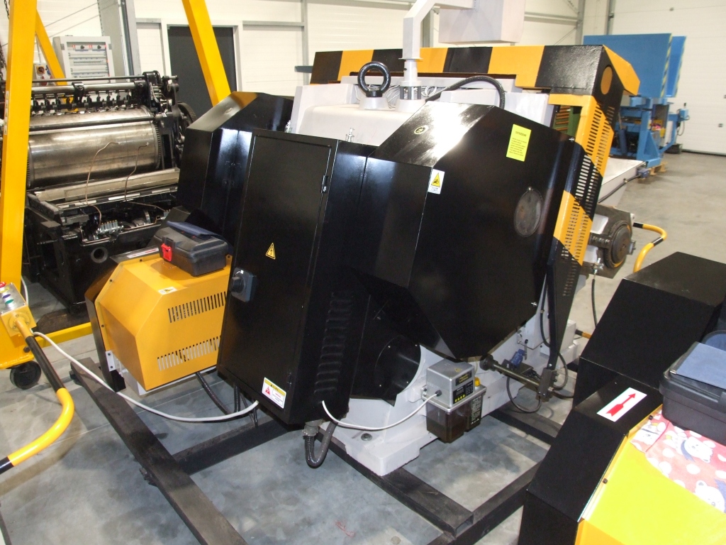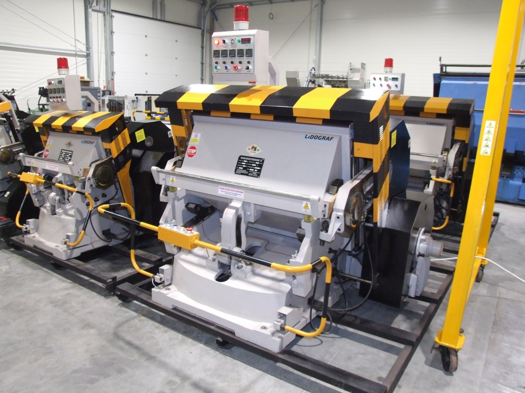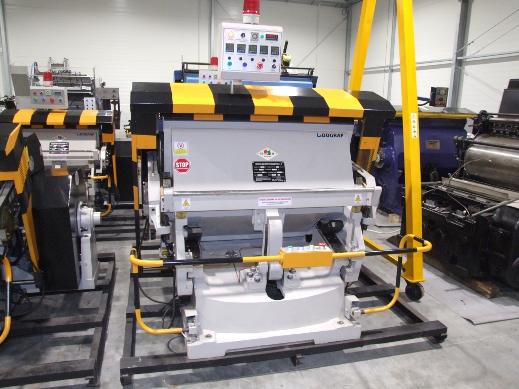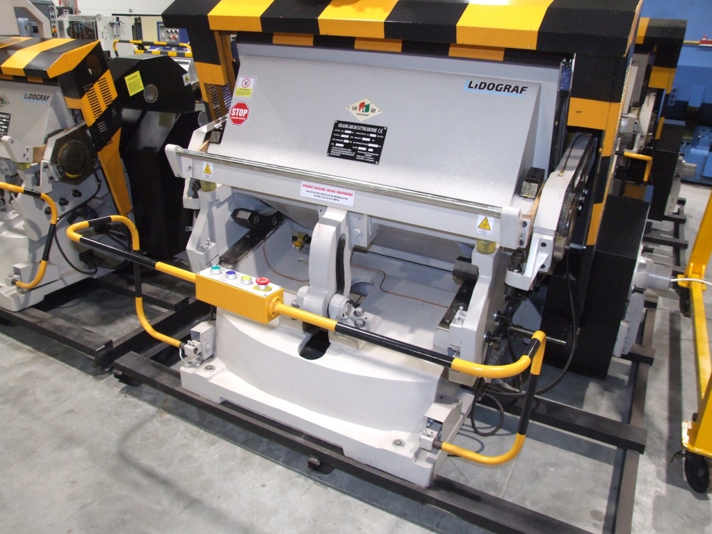 The machine is used to cut shapes from the mold (die) of materials such as paper, cardboard, leather, plastics, etc.
