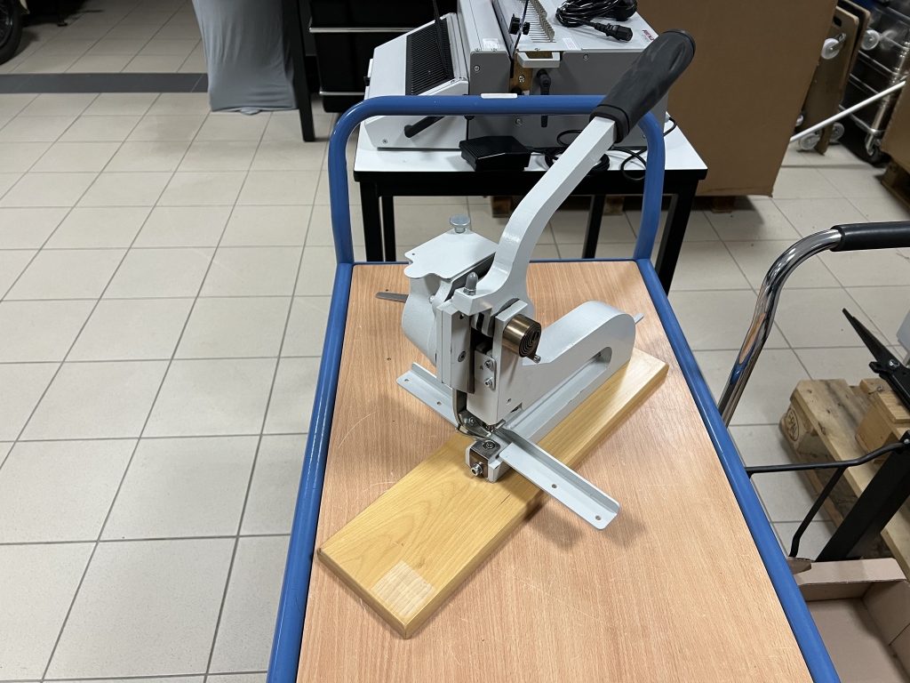 The device feeds the rivet in the right direction, punches the paper and crimps the rivet in one pass.
