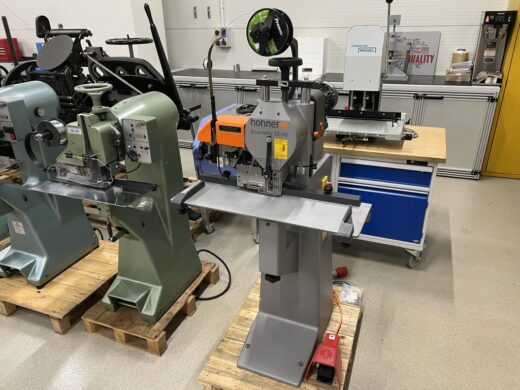The machine has an adjustable table for block and booklet sewing.