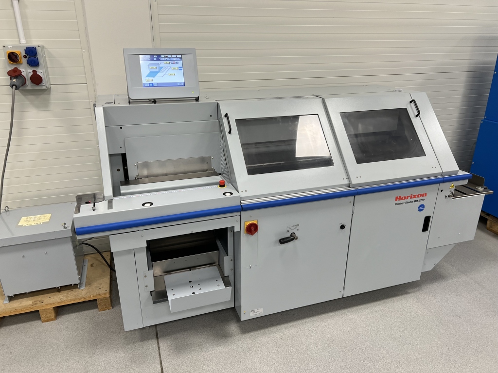 Professional binder for perfect soft binding. Fully automatic gluer with an exceptionally stable structure, equipped with a hot glue gluer, effective also for small and very small quantities of sheets or sheets. The Horizon BQ-270V binder is a single-jaw machine with automatic cover feeding that, operated by one person, delivers impeccably bound books of consistently high quality. Standardly equipped with a scanner for measuring the insert thickness, it allows you to glue books using „on demand” technology