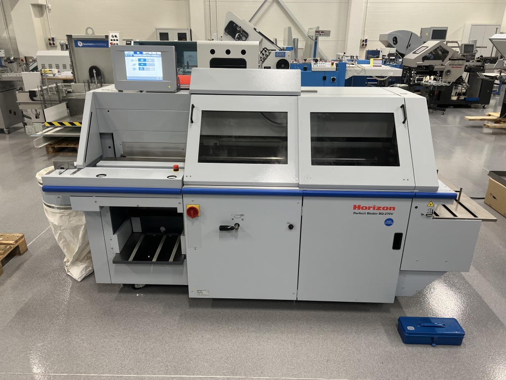 Professional binder for perfect soft binding. Fully automatic gluer with an exceptionally stable structure, equipped with a hot glue gluer, effective also for small and very small quantities of sheets or sheets. The Horizon BQ-270V binder is a single-jaw machine with automatic cover feeding that, operated by one person, delivers impeccably bound books of consistently high quality. Standardly equipped with a scanner for measuring the insert thickness, it allows you to glue books using „on demand” technology