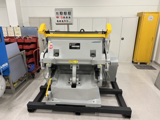 The machine is used to cut shapes from a form (cutting die) of materials such as paper, cardboard, leather, plastics, etc.