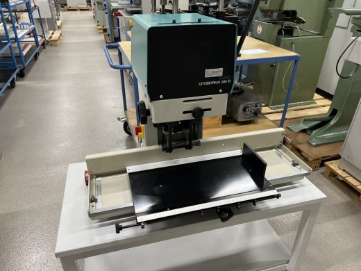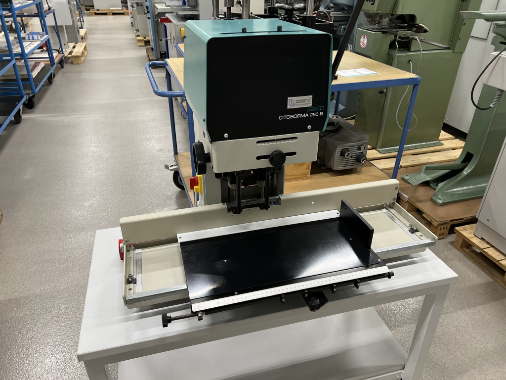 The installed table is an enlarged version. Additionally, the paper drill has an automatic table lock that is released after each cycle.