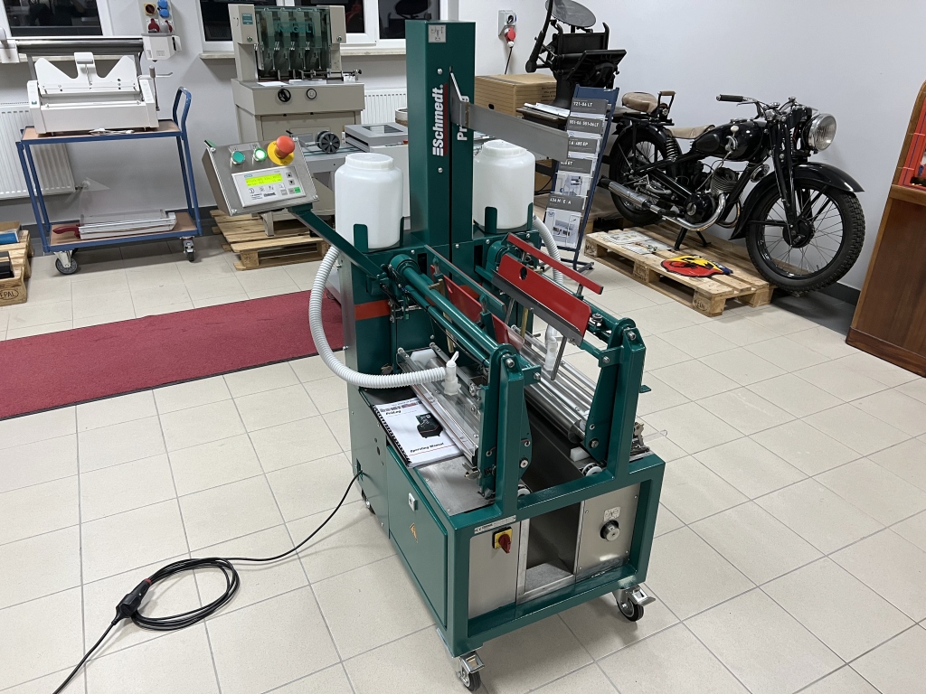 The machine hangs the book block into the prepared hard cover.