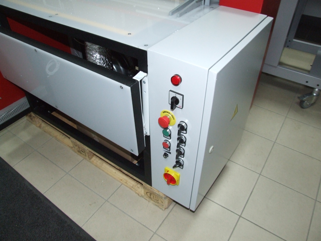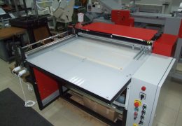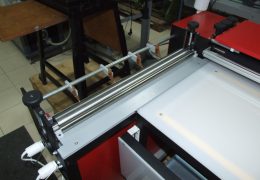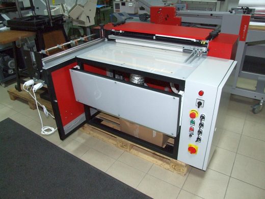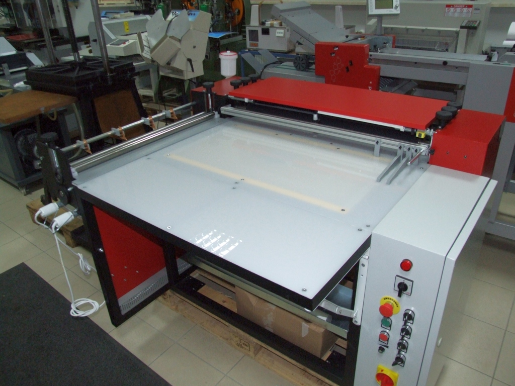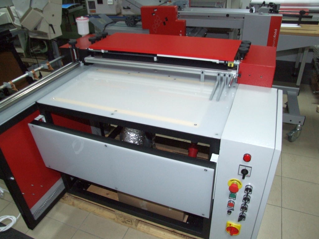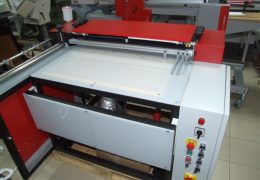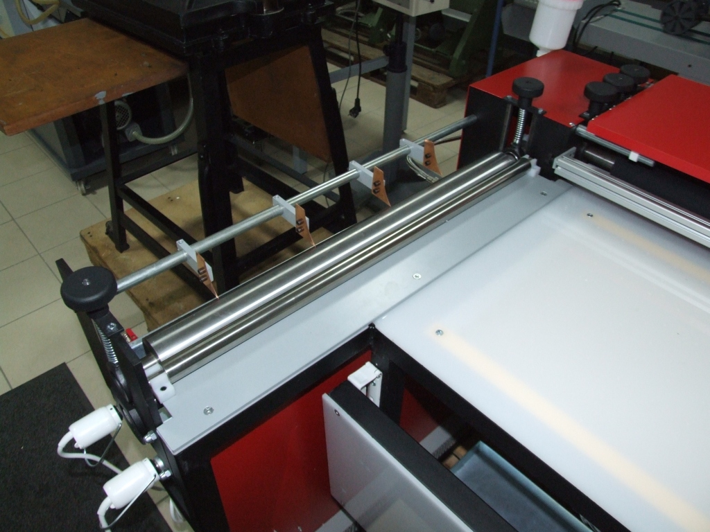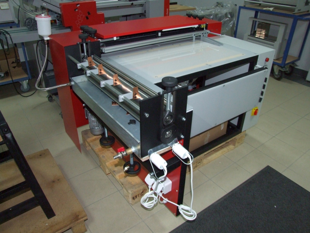 Przygotowaną wstępnie okładkę operator wprowadza ręcznie do urządzenia, w którym następuje zawinięcie i doklejenie góry i dołu okleiny (opatentowany układ szczotek).