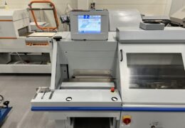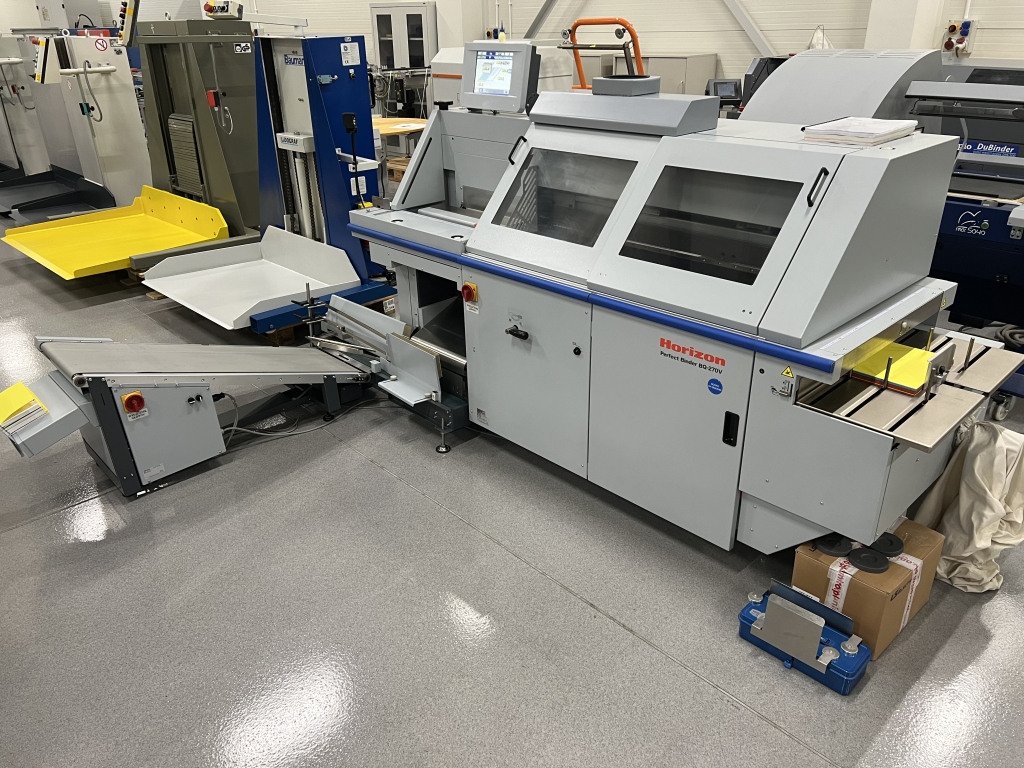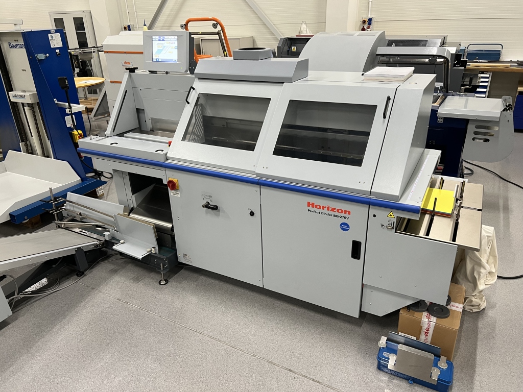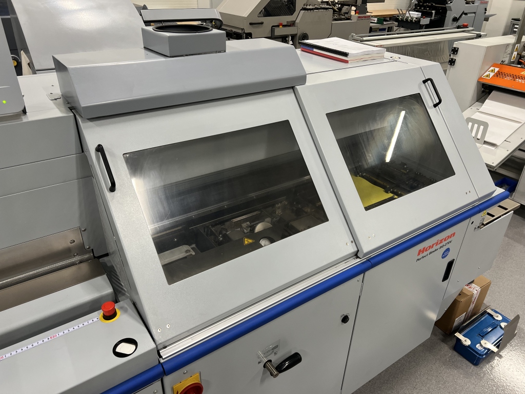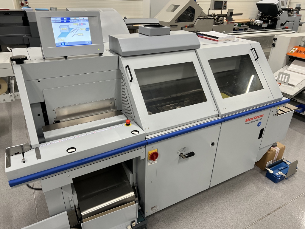 Professional binder for perfect softcover. Fully automatic binder with an exceptionally stable type of construction, equipped with a hot glue gluing device, effective also for small and very small quantities of legs or sheets. The Horizon BQ-270V binder is a single-jaw machine with automatic cover feeding, which, operated by one person, delivers impeccably bound books in consistently high quality. Standardly equipped with a scanner measuring the thickness of the insert, it allows you to glue books using the „on demand” technology.