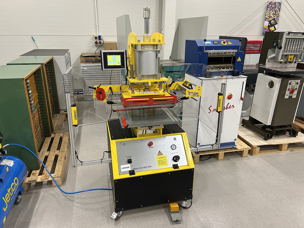 HFS-450 Automatic/pneumatic cold and hot stamping machine. Rigid welded steel construction, pneumatic piston with smooth adjustment of the clamping force and automatic control system guarantee high quality and repeatability of performed works. The device has been equipped with an automatic foil advance, which significantly shortens the time of a single gilding cycle, a worktop, an adjustable depth of embossing, a hotplate ground with an accuracy of 0.01 mm, which significantly increases the quality of embossing with large dies, a touch panel and modern OMRON control.