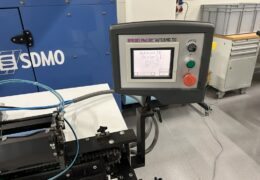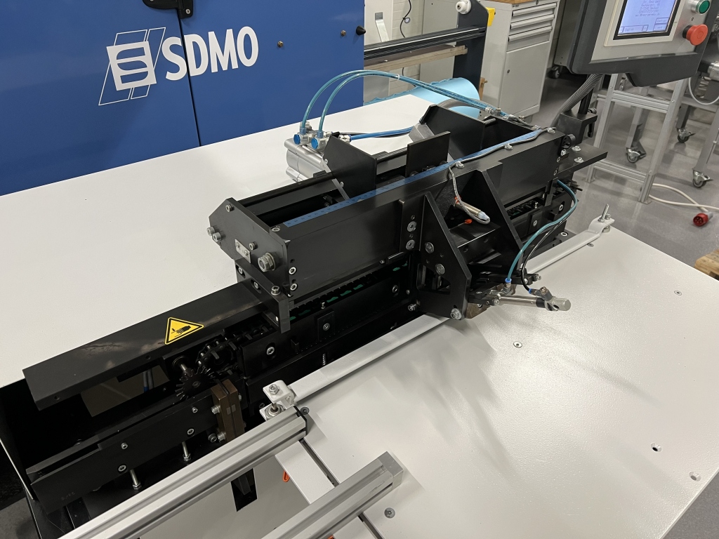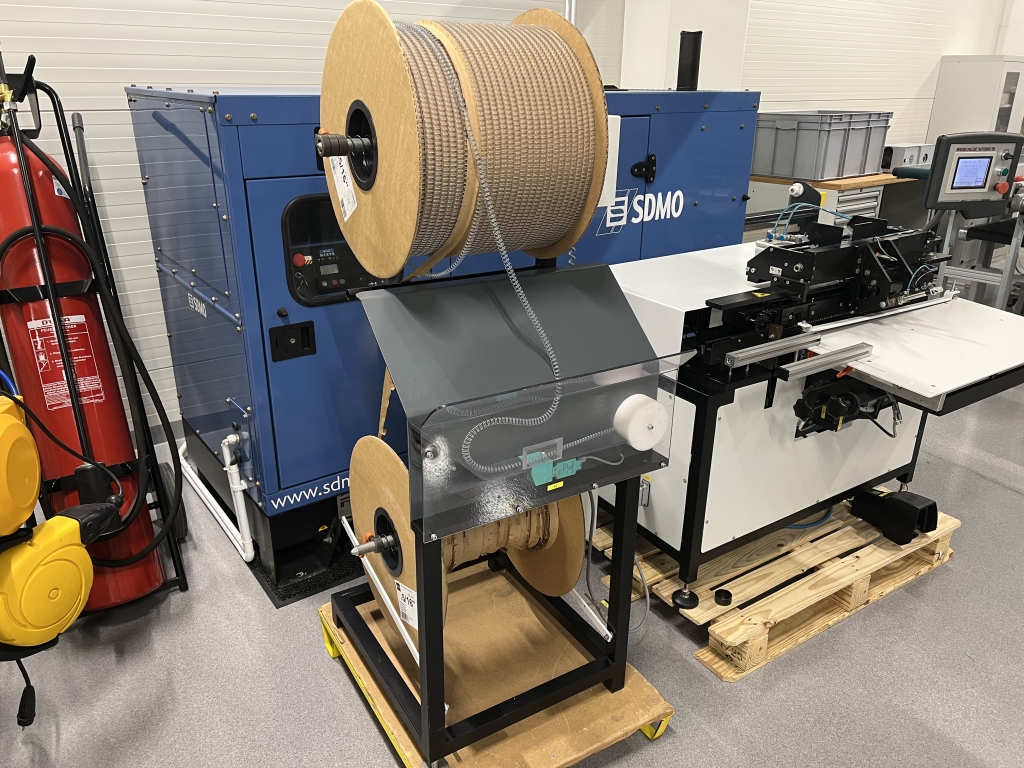 The semi-automatic machine unwinds the spiral from the spool, counts the stitches, cuts the spiral to the pre-set stitch count, and transfers the spiral section to the crimping area.