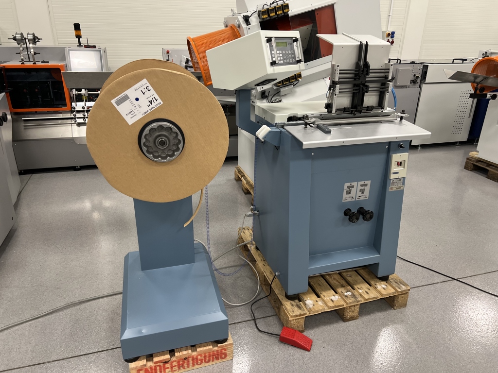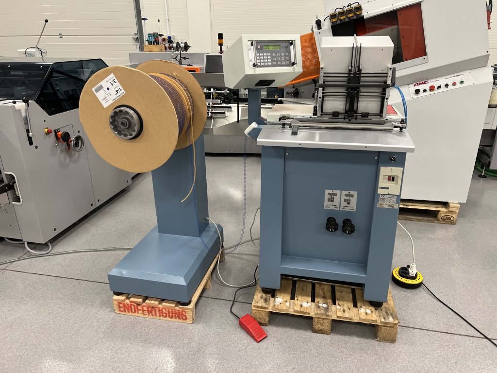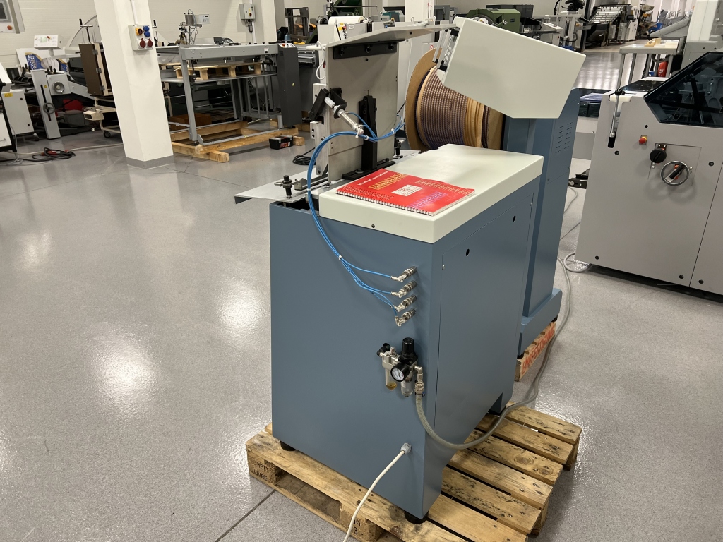 Efficient semi-automatic machine for producing calendars, notebooks, and other metal spiral-bound products.