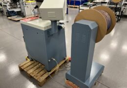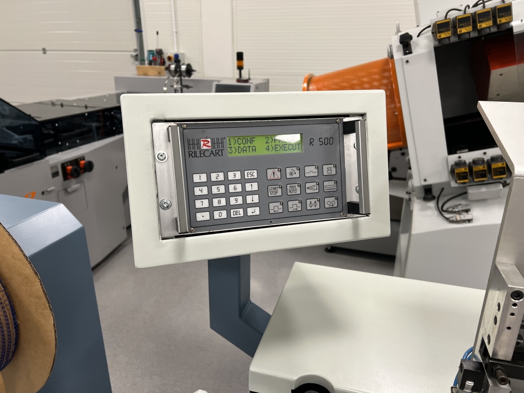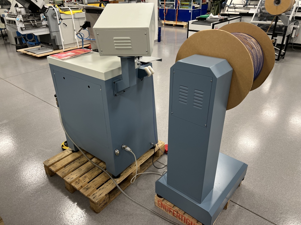 The machine automatically feeds the spiral, cuts the spiral into pre-defined sections, inserts the hanger, and clamps the binding.