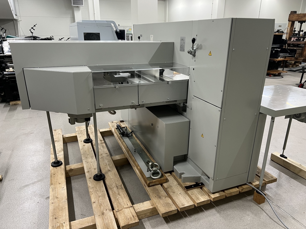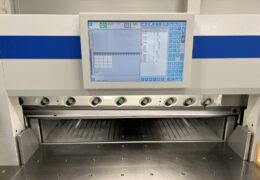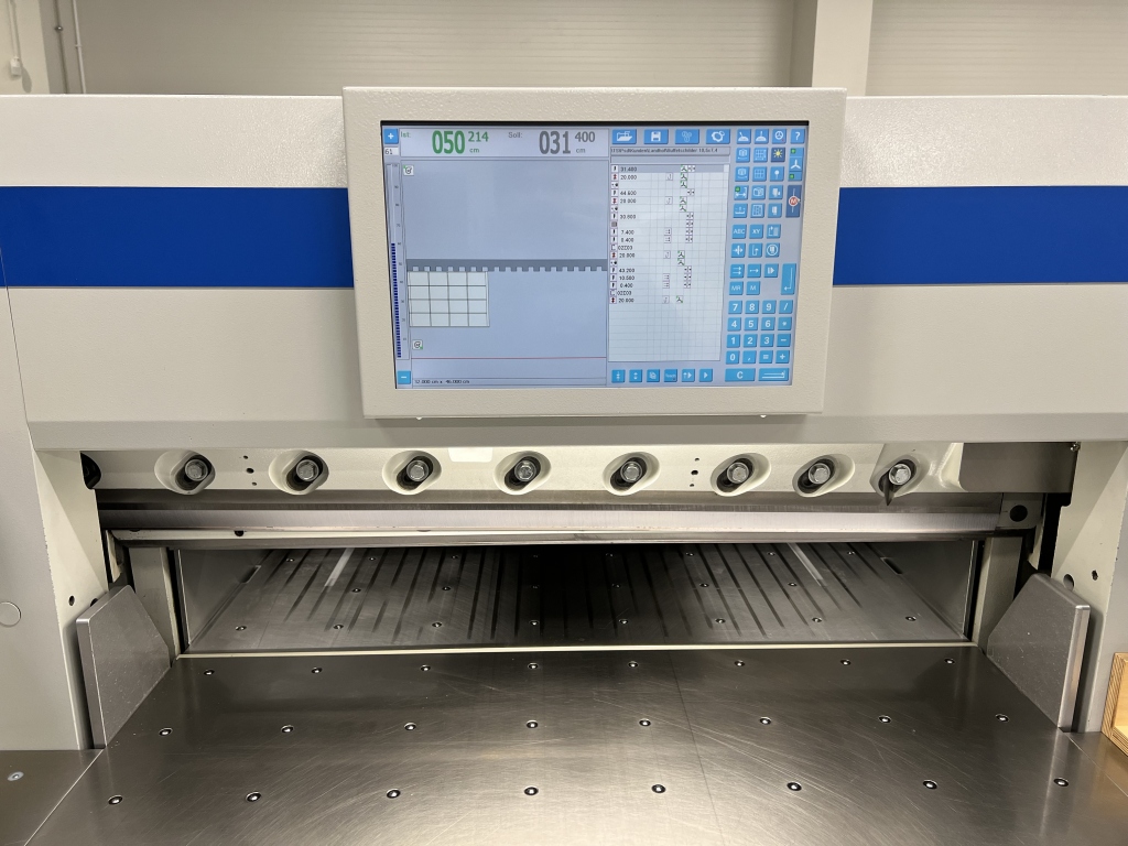 The guillotine can be used as a stand-alone unit or integrated with cutting systems. Program generation takes place in the menu and includes various cutting tasks, e.g. Single cut, Programming, Multiple cut, Non-cutting pressure, Automatic actual value transfer.
