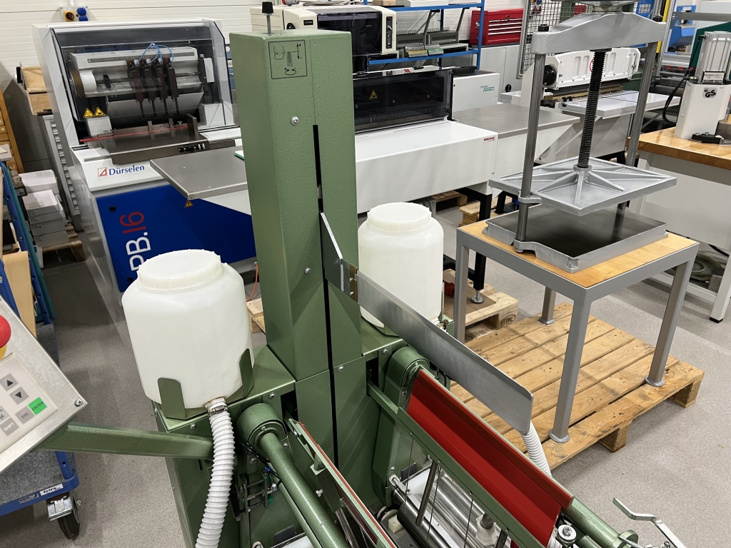 Maszyna zawiesza blok książki w przygotowaną twarda okładkę.